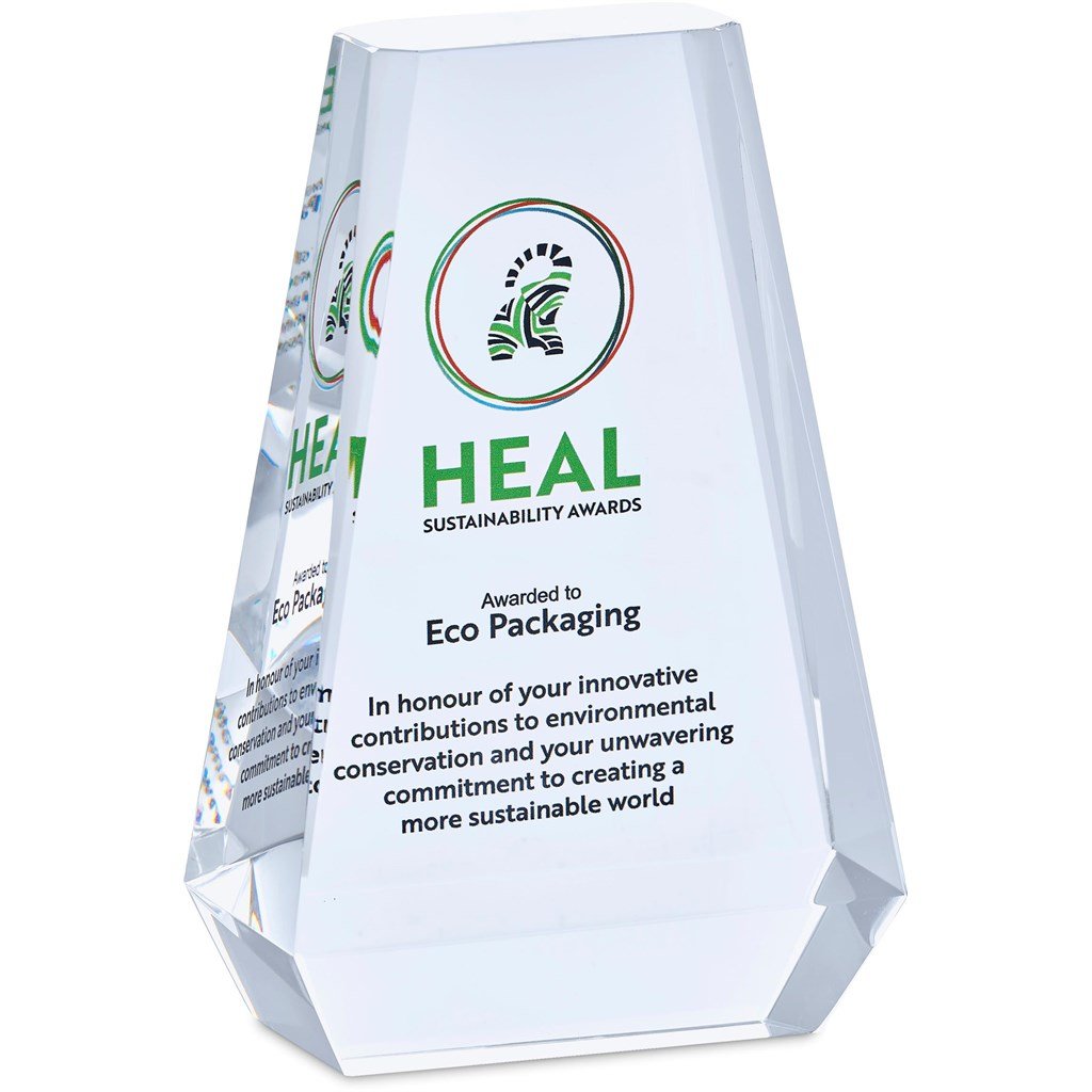 An optical glass award with a large platform for a full colour digital print. Presented in an elegant box with a padded satin lining inner.