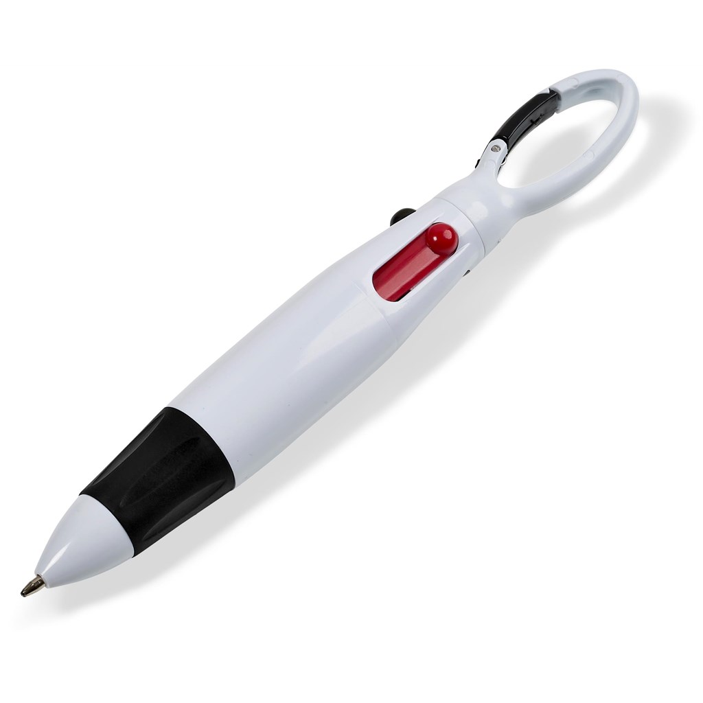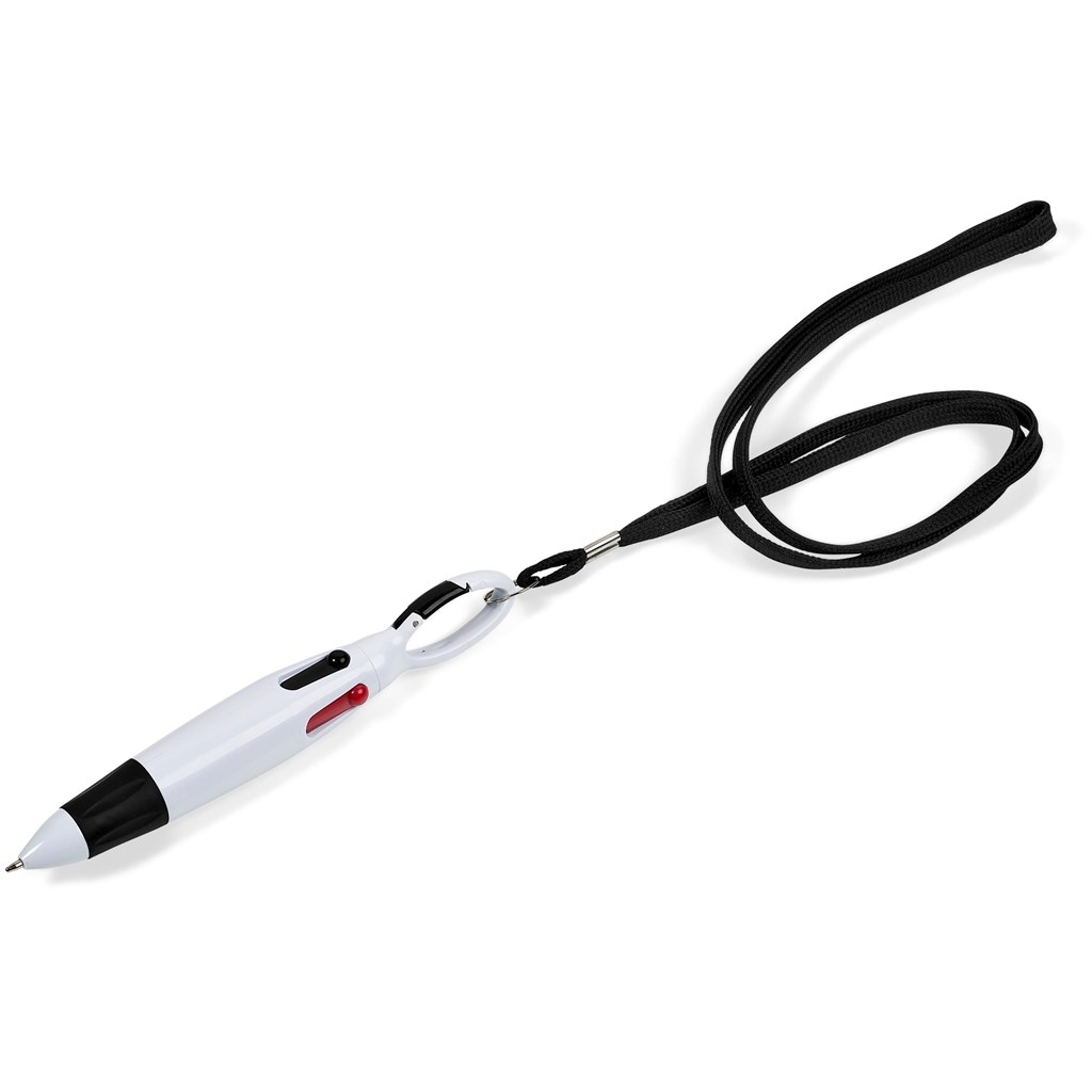 Get 4 different colour ink refills in 1 with this useful carabiner clip ball pen, which includes a slim, basic lanyard to carry on your neck. Consider adding your own custom-made and branded lanyard.