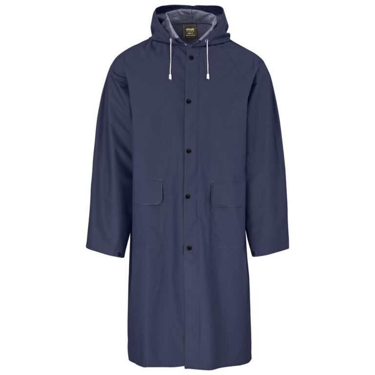 polyester PVC 280g/m2 hood concealed storm flap open end sleeves relaxed fit light usage rainwear