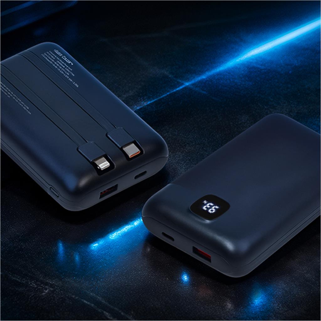 This power bank is for those who need lots of extra power. With a much larger capacity than standard 10 000mAh models, it’s ideal for extended travel, long workdays, and charging multiple devices from a single compact unit. The integrated Type-C and Lightning cables provide convenient plug-in charging without additional accessories, while fast charge support helps you top up compatible devices quickly. A digital display shows the remaining power level, making this a dependable high-capacity option for everyday and on-the-move use.